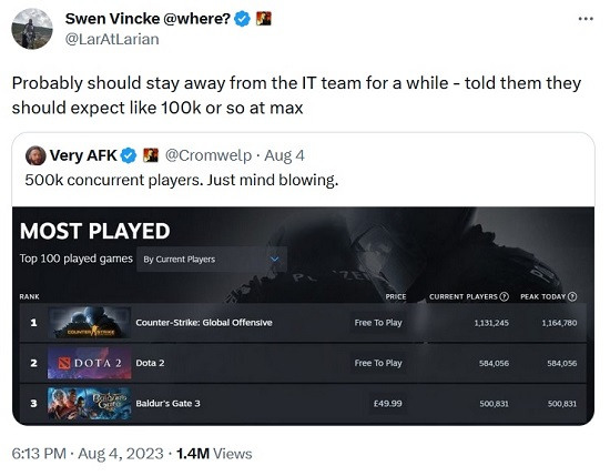 «Provavelmente, algum tempo precisará ficar longe da equipe de TI – disse a eles que vale a pena esperar por não mais de 100 mil no pico”, comentou Vincke sobre a conquista de meio milhão de jogadores simultâneos do Baldur’s Gate 3.