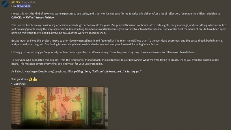 De acordo com Zapshock, a criação de Fallout: Nuevo México tem sido sua paixão nos últimos anos, mas estava na hora de ele “se concentrar na saúde mental e olhar para a verdade”.