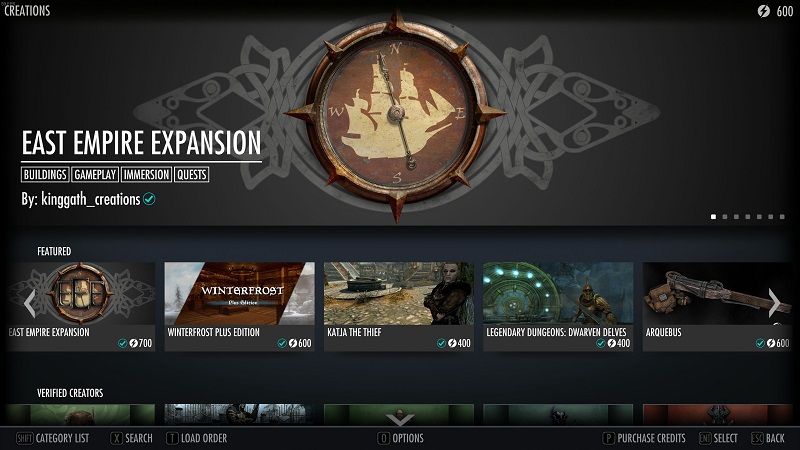 Mods pagos de autores confiáveis, agora vendidos através de “Creations”, podem ser adquiridos com créditos que custam de US$ 8 por 750 unidades a US$ 40 por 5.500. Muitos jogadores acharam os preços na nova loja superfaturados.