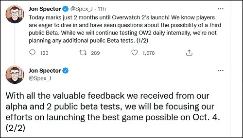 O diretor comercial da Overwatch e vice-presidente da franquia Overwatch, Jon Spector, comentou sobre a possibilidade de um terceiro teste beta público do shooter baseado em equipe de shareware Overwatch 2.