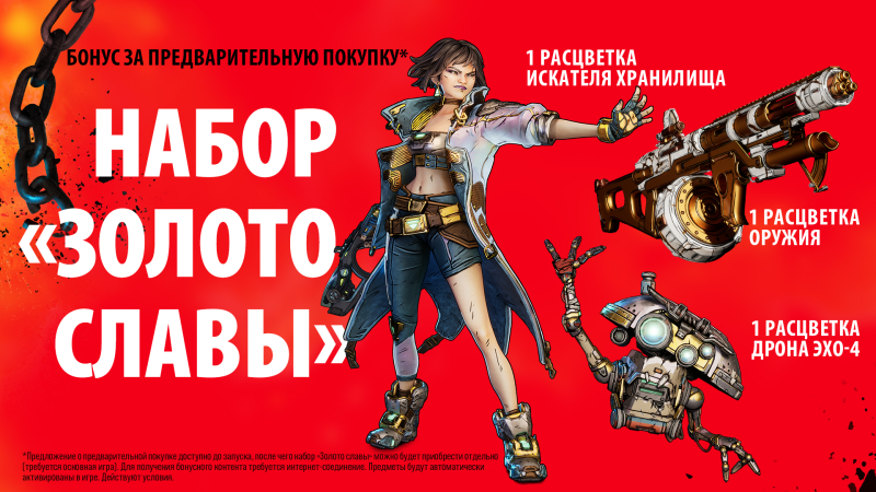 - Pacote Vault Hunter – 2 novos Vault Hunters, 2 expansões de história, 2 regiões de mapa, novos equipamentos e armas e itens cosméticos para Vault Hunters e ECHO-4.