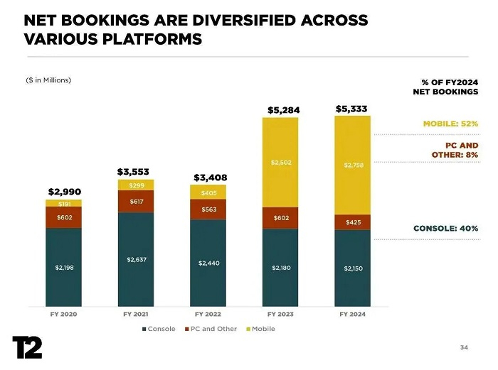 40% da receita líquida da Take-Two no ano fiscal veio de consoles e 8% de PC (Fonte da imagem: Take-Two Interactive)
