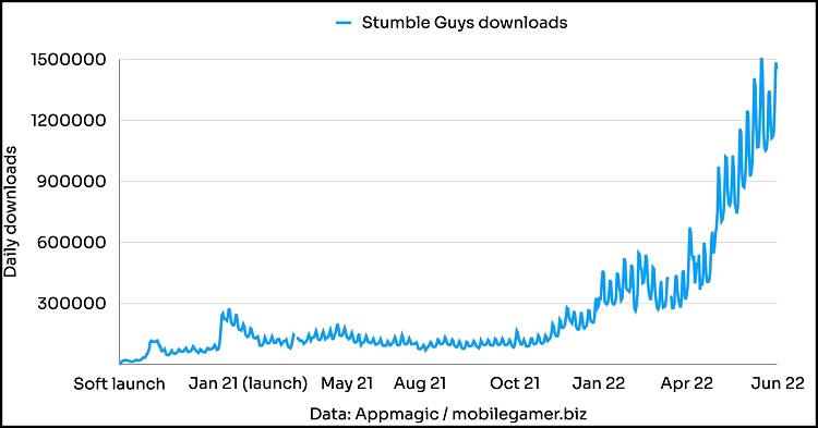 Segundo o AppMagic, entre janeiro e março de 2022, os downloads diários de Stumble Guys subiram para 300-500 mil por dia, e atingiram um pico em 25 de junho, quando o jogo foi baixado por mais de 1,5 milhão de pessoas (32,8 milhões por mês).
