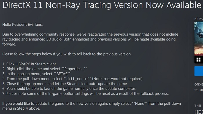 A Capcom ouviu as críticas e adicionou a possibilidade de retornar à versão sem ray tracing, mas com suporte para DirectX 11. Para isso, através das propriedades do jogo (aba “Versões Beta”) na biblioteca Steam, selecione a opção dx11_non-rt.