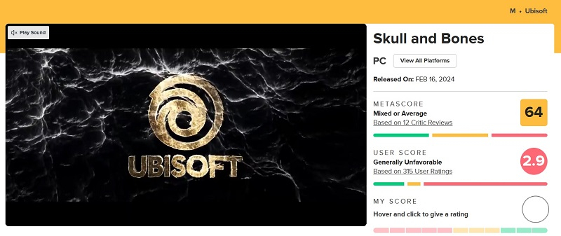 O indicador de avaliação do usuário para Skull and Bones também foi formado no Metacritic. Com base em 321 avaliações, obteve apenas 2,9 em 10. A maioria (72% do total) das respostas são negativas.