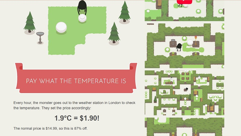 Em particular, o preço de A Good Snowman is Hard to Build na plataforma itch.io mudará a cada hora, dependendo da temperatura atual em Londres, que é monitorada pelo portal meteorológico OpenWeather.
