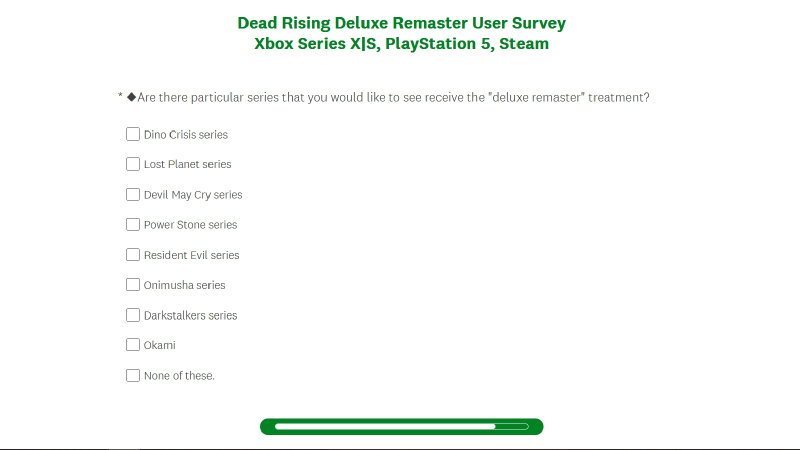 A referida pesquisa, entre outras coisas, pede aos usuários que escolham quais relançamentos estendidos de jogos de quais franquias da Capcom seriam de interesse potencial para os usuários, se houver.