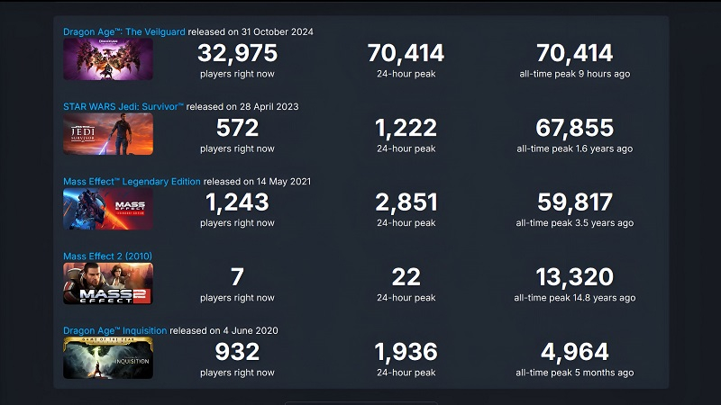 Graças ao indicador alcançado, Dragon Age: The Veilguard também superou o jogo de ação Jedi Star Wars Jedi: Survivor, que registrou 68,7 mil pessoas em seu lançamento em abril passado.