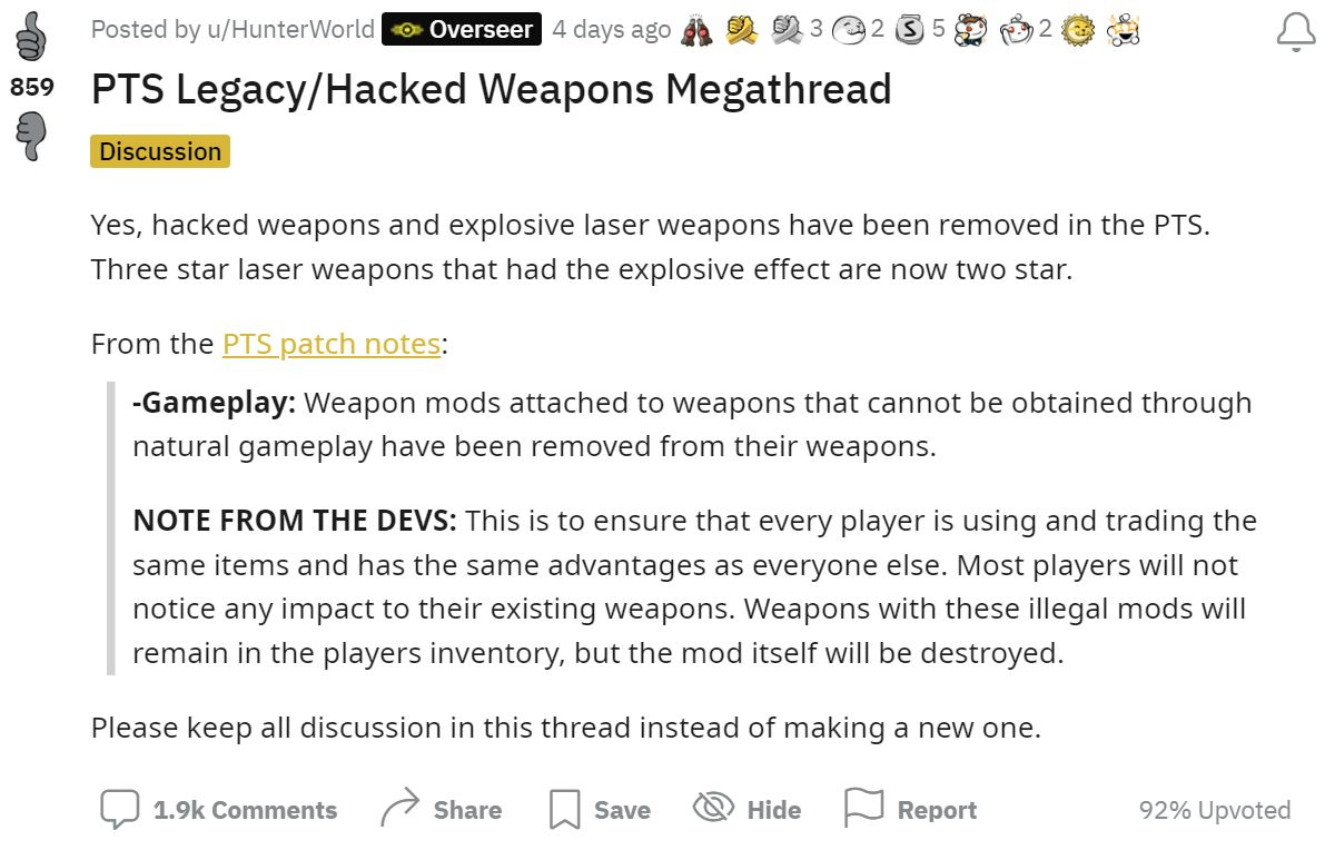 «Embora estejamos jogando em um mundo pós-apocalíptico, queremos que este mundo permaneça justo, divertido e amigável para todos, escreveram os criadores no blog Bethesda.net. – Enquanto você pesquisava e reconstruía, estávamos preparando um novo sistema que livrará o jogo de combinações e modificações de armas que violam o contrato do usuário. Dessa forma, poderemos garantir que todos os jogadores usem, vendam e comprem os mesmos itens e tenham benefícios iguais. A maioria não notará nenhuma mudança, mas os proprietários de armas com mods que não podem ser anexados de acordo com as regras do jogo perceberão que os mods desapareceram e o dano foi reduzido.”