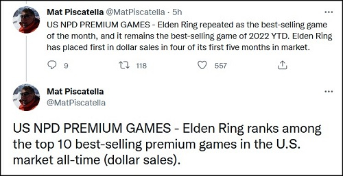O analista do NPD Group Mat Piscatella (Mat Piscatella) em seu microblog falou sobre o novo sucesso da ação de RPG de fantasia com o mundo aberto Elden Ring no mercado de vendas dos EUA.