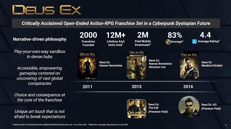 Deus Ex tem números mais modestos: 12 milhões de cópias vendidas no total para Deus Ex: Human Revolution (incluindo a Edição do Diretor) e Deus Ex: Mankind Divided, além de 2 milhões de downloads de jogos premium para celular.