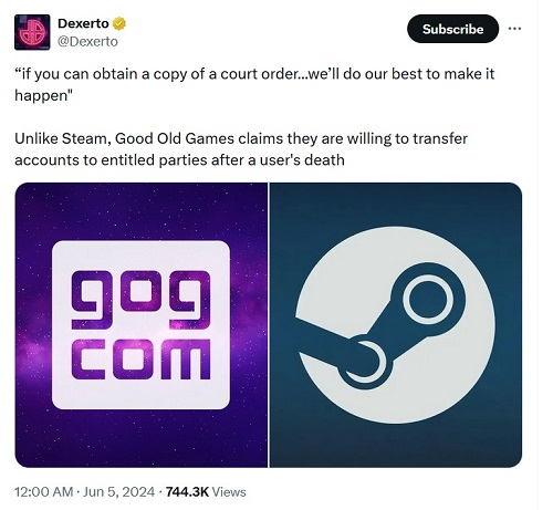Segundo o portal Dexerto, ao contrário do Steam, a loja digital GOG, propriedade da empresa polaca CD Projekt, não é contra o utilizador transferir a sua conta, por exemplo, por herança.
