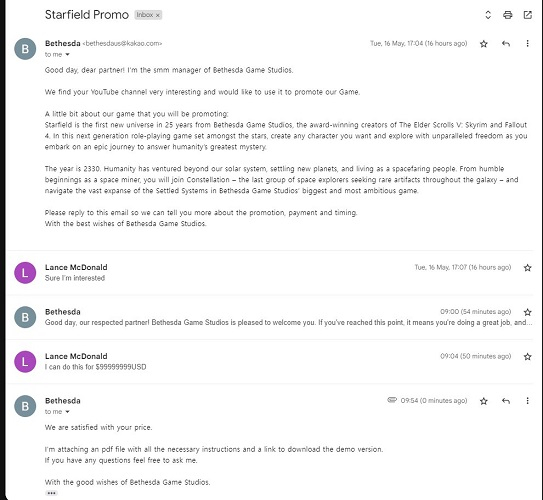 A julgar pela correspondência tornada pública por McDonald com o “gerente” da Bethesda, a editora ou não poupa dinheiro para a promoção de Starfield, ou está em desespero: a empresa ficou satisfeita com a quantia de $ 100 milhões anunciada pelo modder para cooperação.