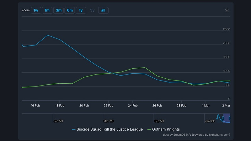 No mês desde sua estreia, o número de jogadores simultâneos de Esquadrão Suicida: Mate a Liga da Justiça caiu para níveis muito menos populares do que o jogo de ação cooperativa de Batman: Arkham Knight, Gotham Knights.