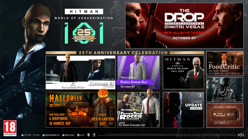 O aniversário também será comemorado em Hitman: World of Assassination (Hitman 3 com conteúdo de Hitman e Hitman 2) com uma série de eventos no jogo (incluindo novos alvos indescritíveis), desafios e trajes alternativos.