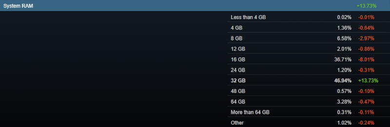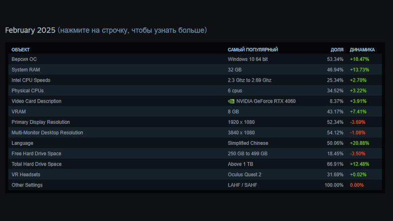 Devido às mudanças, a disposição de muitos indicadores-chave mudou drasticamente. A parcela de usuários do Windows 10 aumentou 10,47 pontos percentuais, embora até agora a popularidade do Windows 11 estivesse crescendo de forma constante. O número de usuários com 32 GB de RAM instalados aumentou drasticamente para 46,94% – em janeiro, 45,07% estavam satisfeitos com 16 GB. A parcela de jogadores com monitores com resolução de 1440p aumentou em 9,92 pontos percentuais. até 29,98%; mas as telas de 1080p continuaram sendo as mais populares, respondendo por 52,34%. Finalmente, em 7,41 p.p. e 4,88 p.p. Consequentemente, a participação de placas de vídeo com 8 e 12 GB de memória aumentou. Se essas grandes mudanças foram impulsionadas pelos usuários na China, então parece que os jogadores daquele país estão falando sério sobre equipar seus PCs.