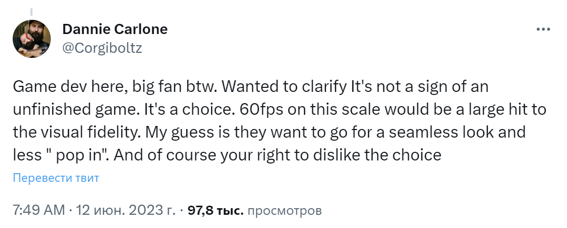 «Quero esclarecer um ponto: isso não é sinal de um jogo inacabado, escreveu Carlon. É a escolha do desenvolvedor. 60 fps nesta escala seria um sério obstáculo para a qualidade dos gráficos. Acho que eles querem obter uma imagem sólida e reduzir o número de objetos que aparecem repentinamente. E, claro, é seu direito não aceitar tal escolha.”