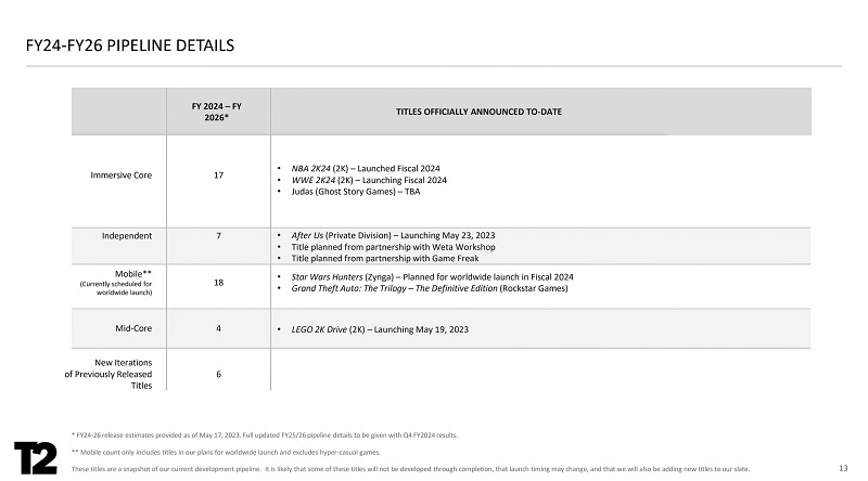 Na apresentação que acompanha o relatório financeiro, a Take-Two fornece uma tabela de lançamentos para o período do ano fiscal de 2024 a 2026. Nesse período, a empresa planeja lançar 17 projetos da categoria principal imersiva.