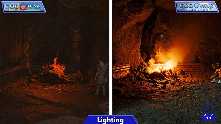 A principal mudança gráfica em God of War Ragnarok em comparação com a parte anterior foi a melhoria da iluminação (especialmente indireta), que simula o comportamento dos raios de luz de forma mais crível (não há ray tracing no jogo).