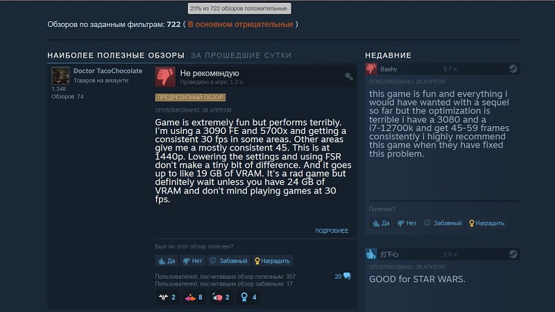 Os jogadores nas análises lamentam outro lançamento de grande orçamento com problemas no início e desejam ignorar a versão para PC de Star Wars Jedi: Survivor até que alguns patches sejam lançados. A ação ainda não recebeu suporte para o idioma russo.