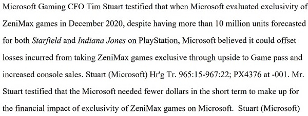 Em um documento sobre as conclusões finais da FTC, o regulador cita o CFO do Xbox, Tim Stuart. Segundo ele, a Microsoft previu “mais de 10 milhões” de vendas no PlayStation “tanto para Starfield quanto para Indiana Jones”, mas decidiu tornar os dois jogos exclusivos de qualquer maneira.