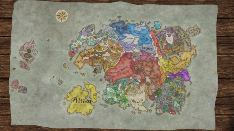 Elder Kings 2 adiciona um mapa detalhado de Tamriel (com o continente de Yokuda) com dois terços do tamanho do Crusader Kings III original. Ao retratar o mundo dos Pergaminhos, os autores se basearam em fontes oficiais e interpretações populares de fãs.