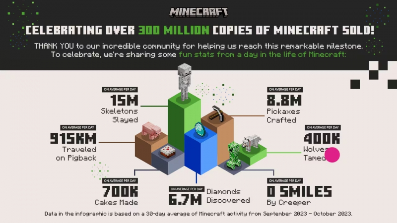 Em setembro-outubro de 2023, os jogadores do Minecraft criaram 8,8 milhões de picaretas, encontraram 6,7 milhões de diamantes e destruíram 15 milhões de esqueletos todos os dias