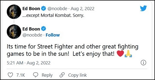 Em resposta a um tweet do portal IGN (já deletado) de que os “desenvolvedores” de Mortal Kombat serão lançados na EVO 2022, Boon apressou-se a esclarecer: não há anúncios apenas para Mortal Kombat no programa de torneios.