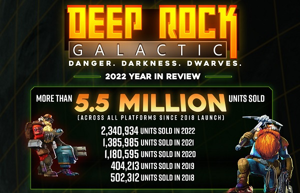 Somente em 2022, foram vendidas 2,34 milhões de cópias de Deep Rock Galactic (um pouco menos do que em 2021 e 2020 no total), o que torna o ano passado o de maior sucesso na história do projeto Ghost Ship Games.