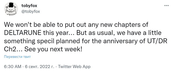 «Não poderemos lançar novos capítulos de Deltarune este ano”, escreveu Toby Fox no Twitter. — Mas de acordo com a tradição, estamos preparando uma pequena surpresa para o aniversário de Undertale e o segundo capítulo de Deltarune. Vejo voce na proxima semana.”