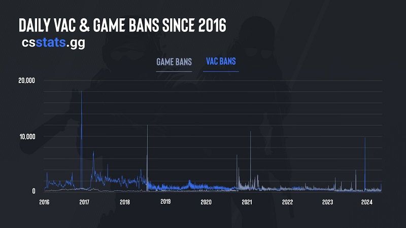 O agregador CS Stats, entretanto, informou que o último fim de semana (especificamente 27 de abril) foi o segundo maior número de proibições de VAC no Counter-Strike 2 (CS:GO) por dia desde 2019.
