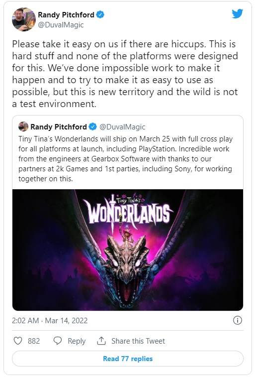 O presidente da Gearbox Software, Randy Pitchford, confirmou que o jogo de tiro de fantasia Tiny Tina’s Wonderlands virá com suporte completo para crossplay. O suporte para esse recurso é anunciado mesmo para as duas gerações de consoles PlayStation, o que não foi implementado em Borderlands 3.