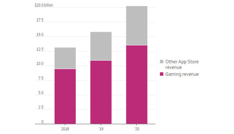 De acordo com a Sensor Tower, no ano fiscal de 2020, usuários de todo o mundo gastaram US $ 45 bilhões em jogos na App Store. Quase 31% desse dinheiro foi gasto na China, 26% nos Estados Unidos. A comissão da Apple foi, portanto, de aproximadamente US $ 13,5 bilhões, ou cerca de 5% das vendas totais da empresa, que atingiram US $ 275 bilhões no período.Metade desse dinheiro veio das vendas do iPhone. A Apple não divulga as receitas da App Store como uma unidade separada – a empresa inclui na categoria de serviços, e aqui os volumes de vendas atingiram US $ 53,8 bilhões.Esta categoria inclui streaming de música, iCloud, Apple TV, publicidade e garantia estendida.