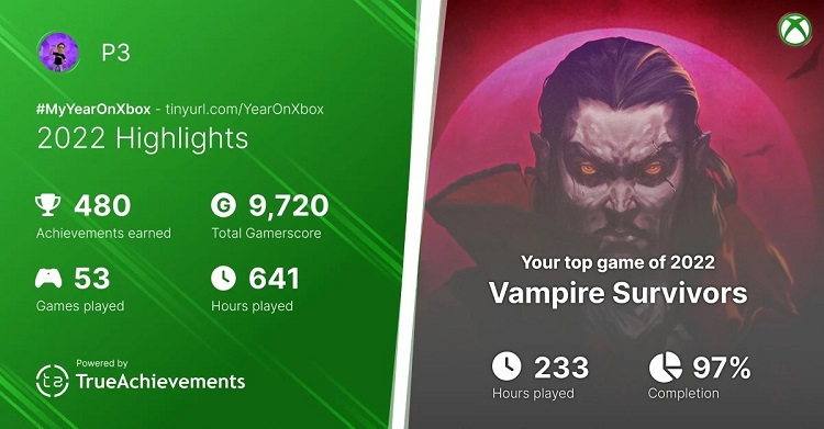 Como ficou conhecido, em 2022, Spencer passou mais de 641 horas em 53 jogos nas plataformas Xbox. Mais de um terço desse número – 233 horas – caiu na ação gótica roguelite Vampire Survivors de poncle.