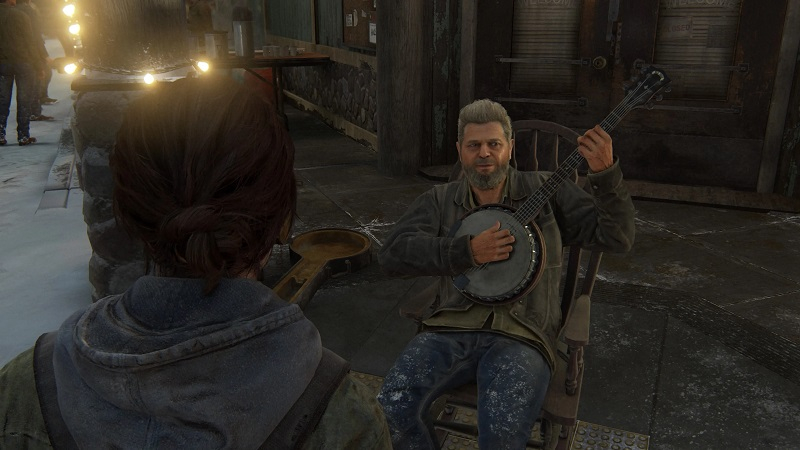 Santaolalla deixou escapar muito ao discutir sua participação especial em The Last of Us Part II – o músico pode ser encontrado nas ruas do assentamento de Jackson logo no início do jogo (veja a captura de tela abaixo), mas eles não foram autorizados a interagir com ele.