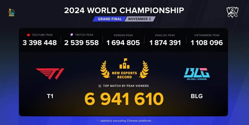 O pico de audiência online para a transmissão do Campeonato Mundial de 2024 foi de 6,94 milhões de pessoas, um número excepcional para assistir a competições de esportes eletrônicos. O recorde anterior foi estabelecido durante a transmissão da grande final do Mundial 2023 (6,4 milhões).