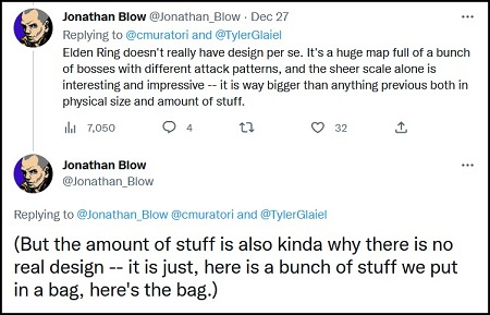 A falta de design como tal aos olhos de Blow não impediu Elden Ring de se tornar um best-seller (17,5 milhões de cópias até 30 de setembro) e coletar dezenas de prêmios (já mais de 180 prêmios de Jogo do Ano de acordo com os usuários do ResetEra).