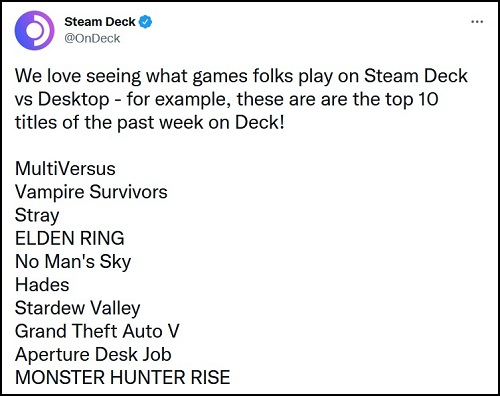 A Valve no microblog oficial do Steam Deck revelou os dez jogos mais populares entre os proprietários de laptops na semana passada.