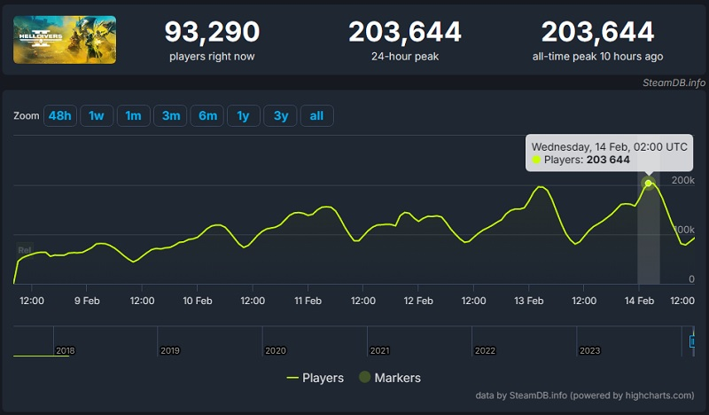 De acordo com o serviço estatístico SteamDB, há nove horas havia 203.644 jogadores no Helldivers 2 (um novo recorde), no momento da publicação deste material havia 93.290 pessoas lá. A liderança no pico online entre os novos projetos é detida pela Palworld com seus 2,1 milhões, o terceiro lugar até agora pertence ao RPG cooperativo de ação com ênfase na sobrevivência Enshrouded.