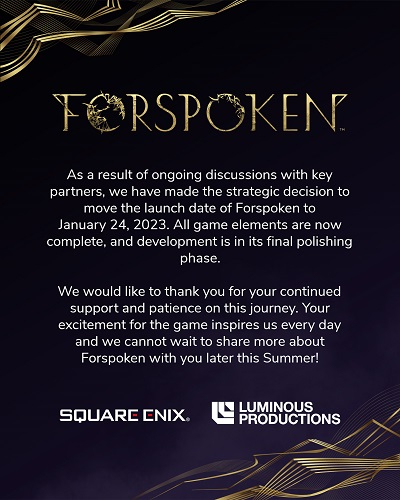 A editora Square Enix e o estúdio de desenvolvimento Luminous Productions no microblog oficial de sua ação de RPG no mundo aberto Forspoken anunciaram outro adiamento do lançamento para uma data posterior.