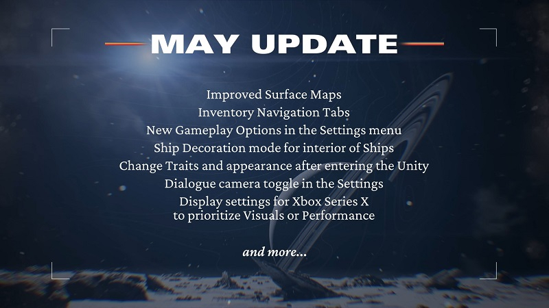 A atualização de maio de Starfield também inclui mapas detalhados da superfície planetária, modificadores de jogabilidade, níveis de dificuldade extremos, a capacidade de personalizar o interior da sua nave e muito mais.