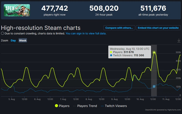 No momento da redação deste artigo, o atual Apex Legends online, de acordo com o SteamDB, era de mais de 477 mil jogadores. O valor máximo de todos os tempos é de 511.676 jogadores, que foi alcançado logo após o lançamento da nova temporada com o Passe de Batalha.