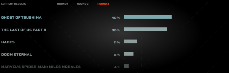 No momento, a operação normal do portal TGA foi retomada, mas The Last of Us Parte II não está mais liderando. Ghost of Tsushima saiu por cima com 40% dos votos. Falta menos de um dia para o final da terceira rodada.