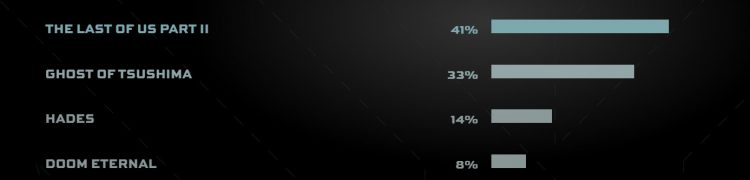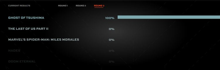 Ontem, dia 6 de dezembro, não foi possível passar a autorização no portal da cerimônia de premiação. E na página onde os usuários escolhem o jogo do ano, uma imagem estranha foi observada: Ghost of Tsushima tinha 100% dos votos, embora antes tivesse 33%, e The Last of Us Parte II – 41%.