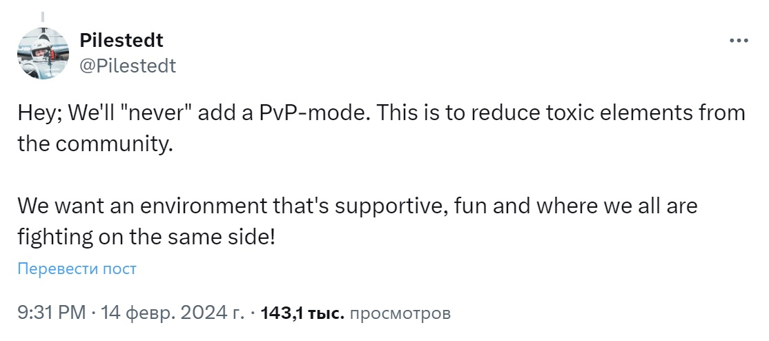 De uma forma ou de outra, nenhuma das atualizações futuras trará o modo PvP. “Nunca adicionaremos um modo PvP”, prometeu o gerente. “Esta decisão se deve ao desejo de reduzir a toxicidade da nossa comunidade. Queremos que os jogadores estejam em um ambiente divertido e amigável, onde todos lutem do mesmo lado.”