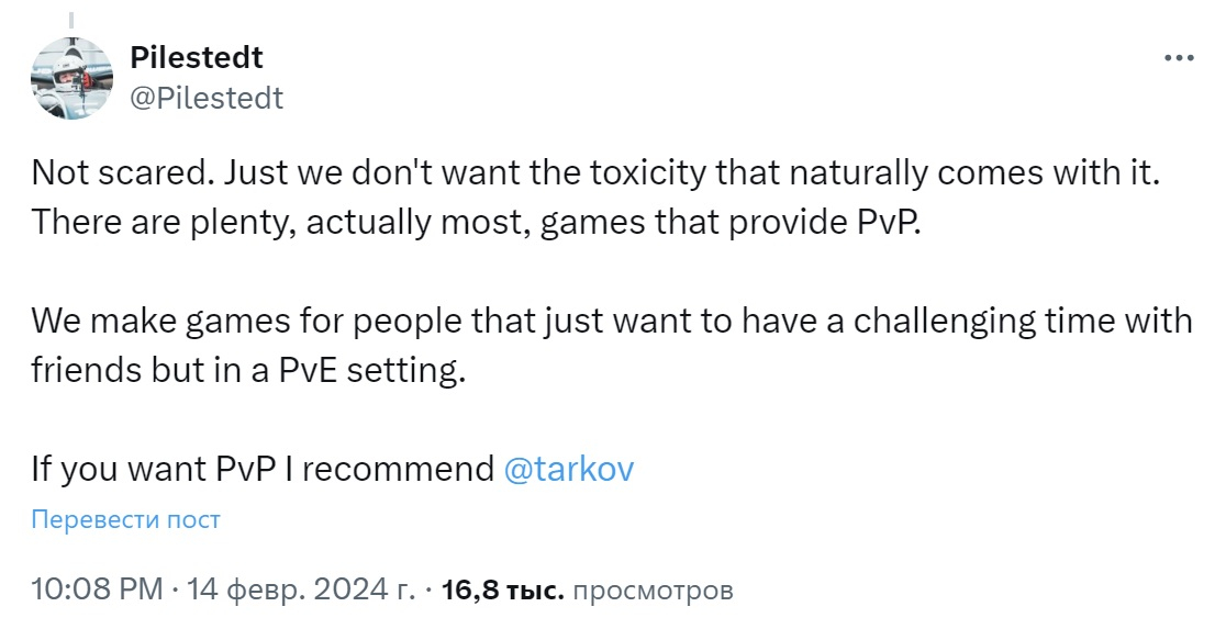 «Não temos medo [de implementar o PvP]”, respondeu Pilestedt a um dos usuários que se opôs. “Simplesmente não queremos lidar com o comportamento tóxico dos usuários que é natural neste modo. Existem muitos jogos (na verdade, a maioria deles) que apresentam um componente PvP. Fazemos jogos para quem quer superar dificuldades junto com os amigos, mas em formato PvE. Se você quiser PvP, recomendo Escape from Tarkov.”