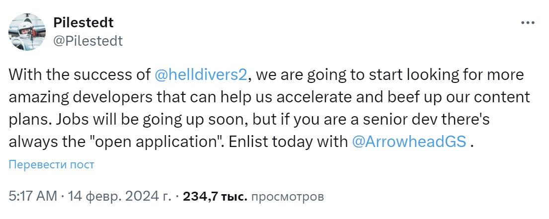 «“Com o sucesso do Helldivers 2, planejamos começar a procurar novos desenvolvedores interessantes para nos ajudar a fornecer atualizações mais rápidas e ricas”, escreveu o chefe do estúdio e líder criativo Johan Pilestedt no Twitter. — Em breve divulgaremos vagas, mas se você é especialista sênior, sempre há vaga para você. Junte-se à Arrowhead Game Studios hoje mesmo.”
