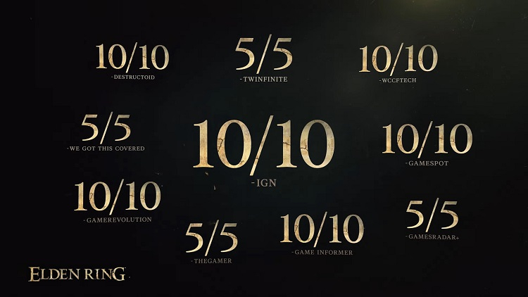 Dada a quantidade de elogios da crítica que Elden Ring recebeu, alguém poderia pensar que o trailer laudatório se estenderia por vários minutos, mas 30 segundos foram suficientes para os desenvolvedores. A propósito, a versão americana do vídeo difere da europeia (veja abaixo).