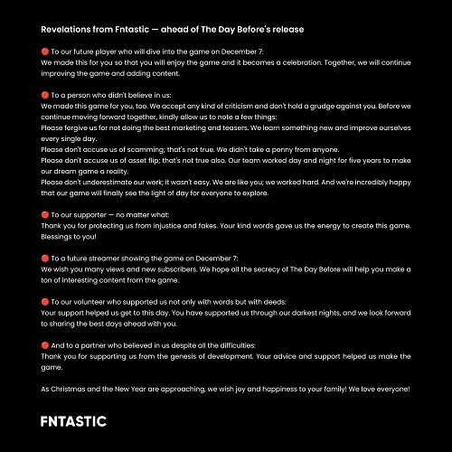Fntastic prometeu aos futuros jogadores melhorar e expandir The Day Before, agradeceu aos fãs pela “proteção contra injustiças e falsificações” e desejou aos streamers mais visualizações e assinantes.