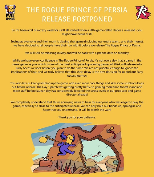 Em meio ao hype em torno de Hades II, que foi lançado em 6 de maio sem aviso prévio da Supergiant Games, Evil Empire decidiu adiar o lançamento de The Rogue Prince of Persia. O jogo ainda começa em maio, mas posteriormente a data exata será anunciada no dia 13.